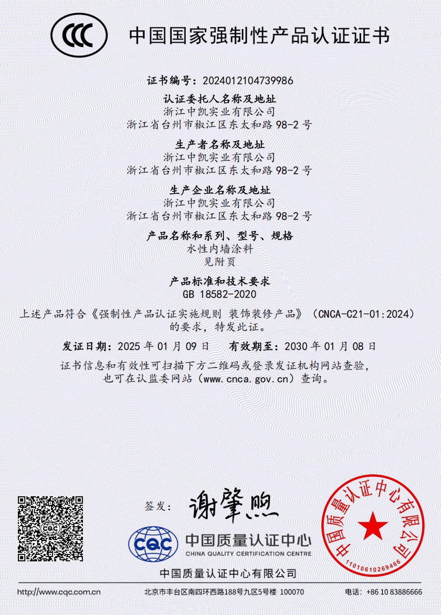 浙江中凱實(shí)業(yè)有限公司是一家由美國(guó)杜邦涂料化工集團(tuán)有限公司提供高新技術(shù),與美國(guó)杜邦化工集團(tuán)有限公司授權(quán)在中國(guó)生產(chǎn)各種建筑涂料的制造企業(yè)。